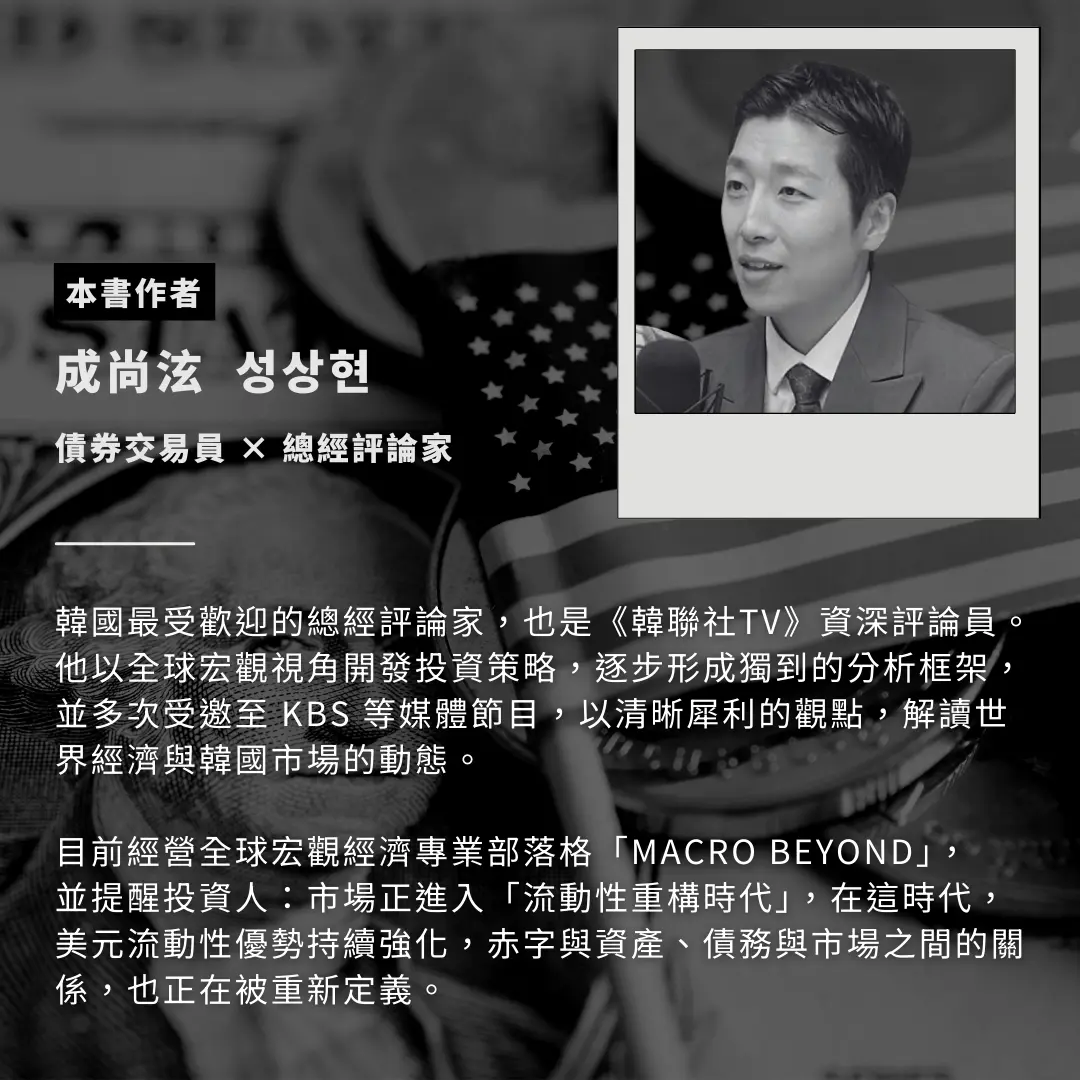 韓國知名總經分析師成尚泫,以14年操盤國家退休基金的專業,揭示「流動性重構」如何改變投資邏輯:美債從負債變成武器,AI 成為產業回流的引線,穩定幣則是美元數位殖民的潛行工具。