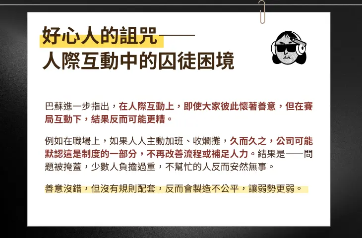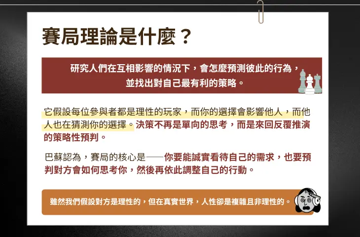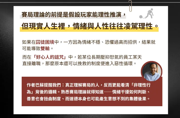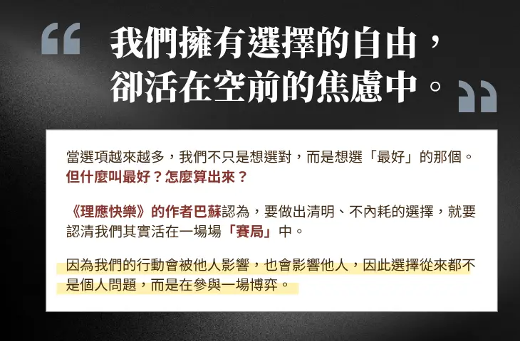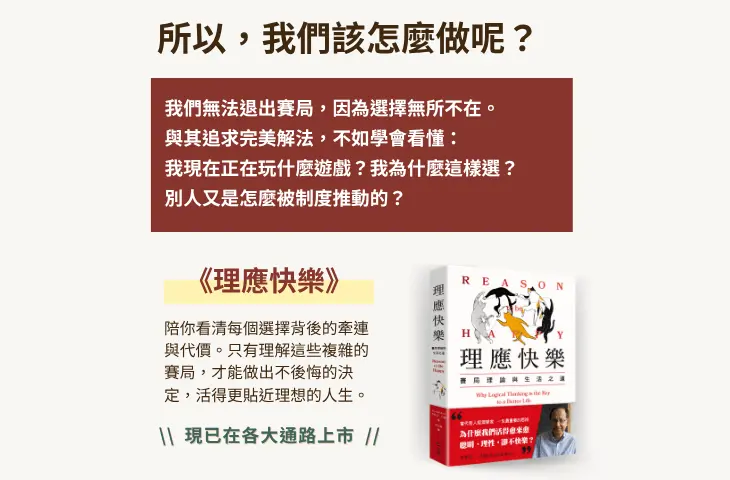 我們以為自己在自由選擇,實際上卻活在一場看不見規則的賽局中:說真話、辭職、愛一個人——每個選擇都受制度與他人影響。我們不知不覺用理性說服自己、馴服自己,卻越活越焦慮。
