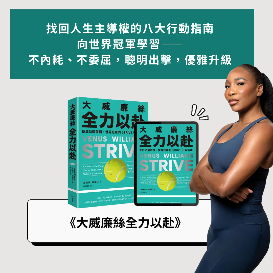 從乾燥症打亂人生節奏,到重新建立適合自己的生活系統,大威廉絲創造出「STRIVE」行動法:每天安排八個關鍵行動,以小步調構築長期穩定,讓巔峰狀態不再只是偶然。無論你正在卡關、迷路,或只是想更穩地向前走,它都能陪你重建節奏,活出你自己的節拍人生。