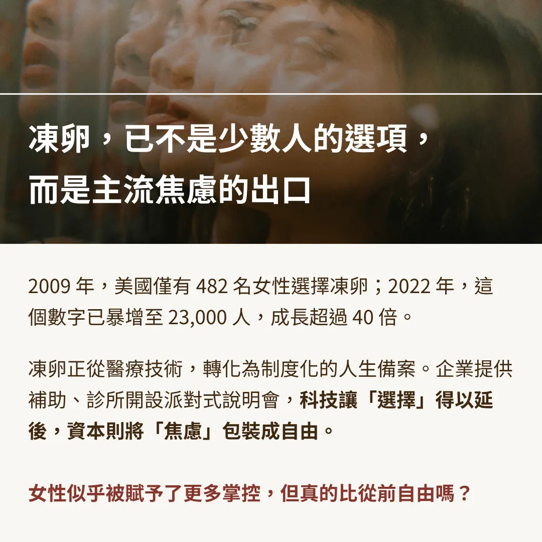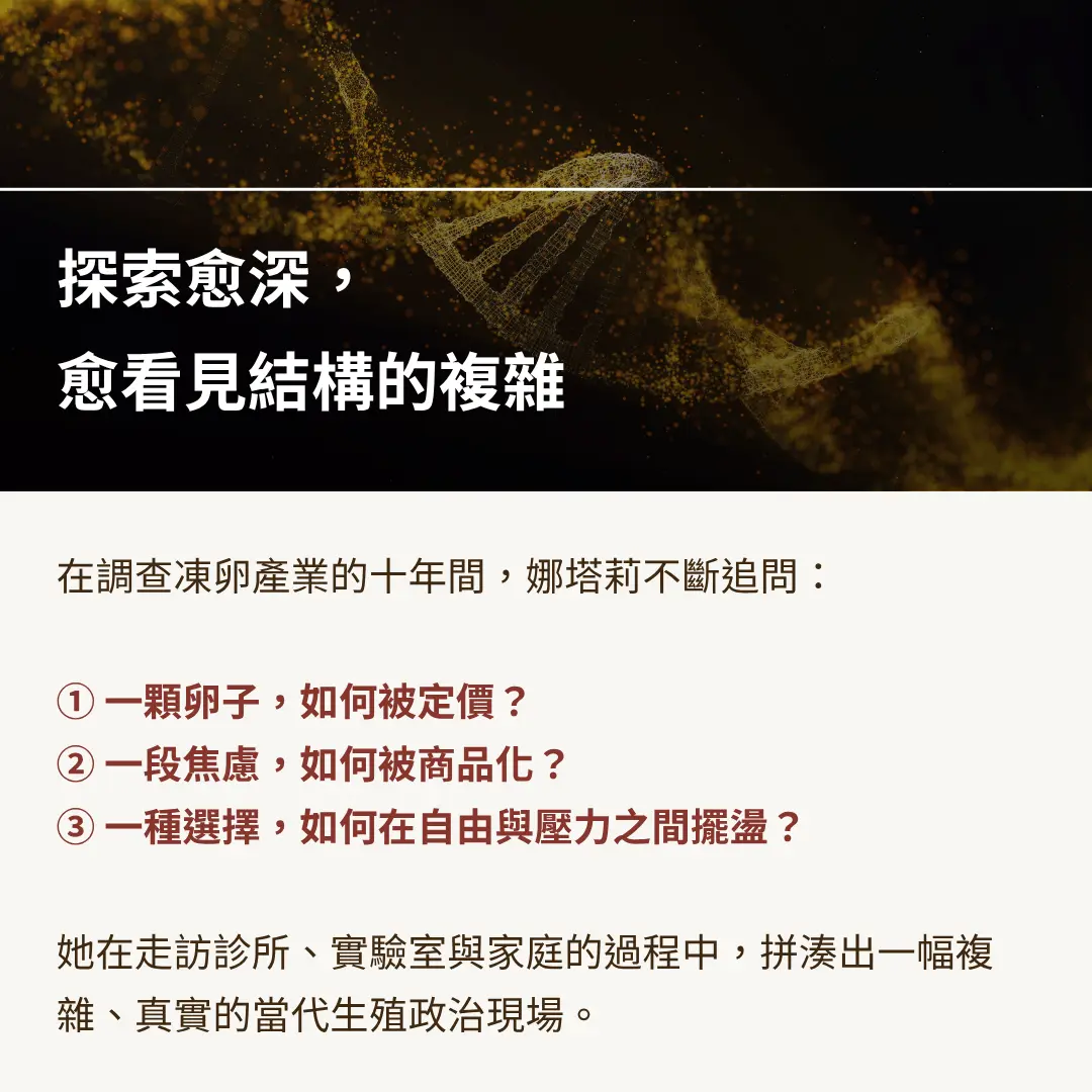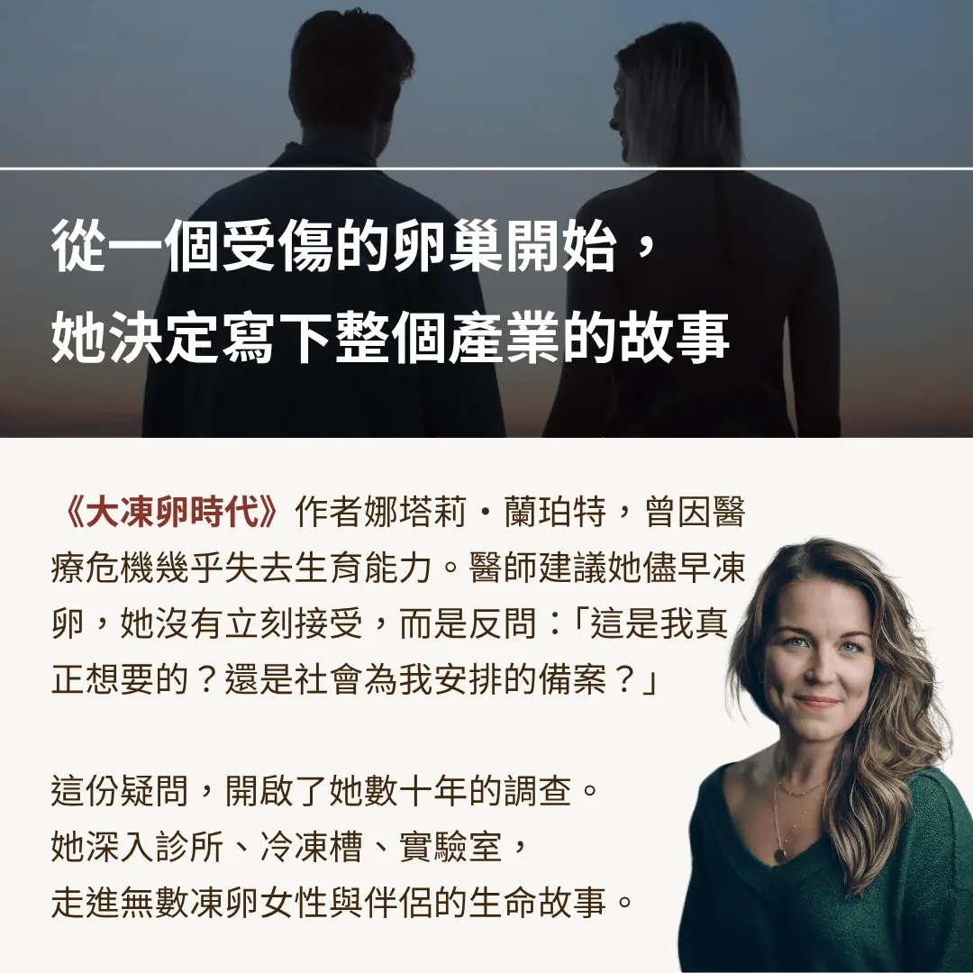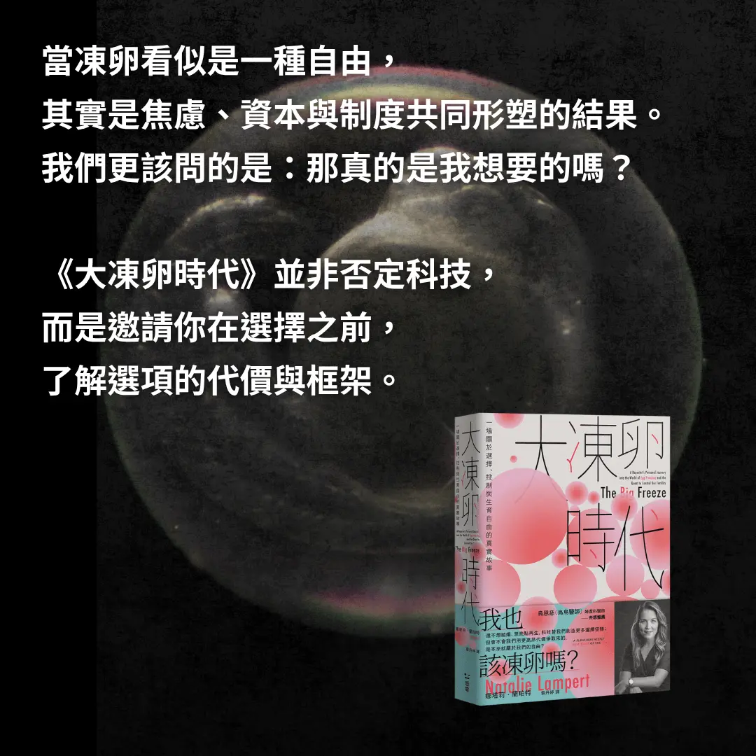 《大凍卵時代》是一部穿梭診所、冷凍槽與產業模型的深度紀實作品,揭開卵子冷凍這門「以自由為名」的生育選項,如何在現代社會中成為由焦慮推動、由資本操盤的商品。作者蘭珀特以自身經驗為起點,訪談無數女性與產業關鍵角色,細緻拆解這場結合身體科技與性別政治的供應鏈。