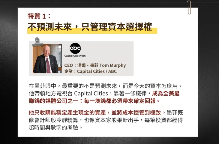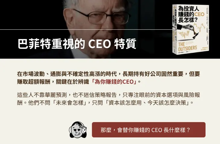 在市場波動、通膨與不確定性高漲的時代,長期持有好公司固然重要,但要賺取超額報酬,關鍵在於辨識「為你賺錢的CEO」。本書提供一份高績效領導者的行動清單——從資本配置集中決策、靈活應對不確定性、獨立自主判斷,到在機會來臨時迅速果斷出手。