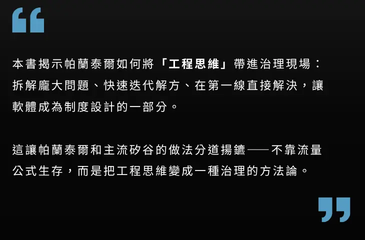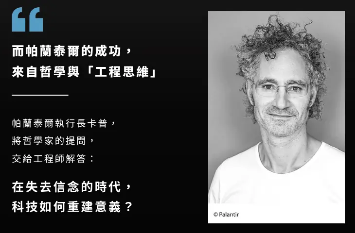 與典型理工背景的矽谷創業家不同,卡普是一位哲學博士。他把哲學家的提問交給工程師回應,推動所謂「工程思維」:拆解龐大問題、快速迭代解方、授權前線行動,讓軟體直接成為制度的一部分。