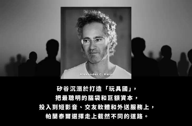 帕蘭泰爾 Palantir 執行長亞歷山大・卡普直言,當今矽谷沉迷於短影音、交友軟體與外送服務,浪費天才頭腦與資本,只為滿足原始欲望。他卻帶領帕蘭泰爾走上另一條道路——專注於國防、情報與制度設計等國家級難題,證明科技真正的價值,是解決時代的集體困境。